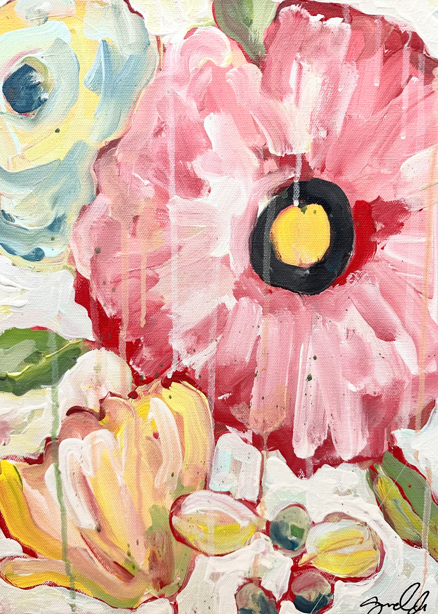 This is a 36x48 inch painting created on a 3/4 inch deep canvas using acrylic paint. It was named after one of Ginny's close friends. It was crafted with a palette knife, which adds a loose and expressive quality to the piece. The painting features layered colors that create a bold impression. Each flower introduces a new hue, celebrating the overall composition.
