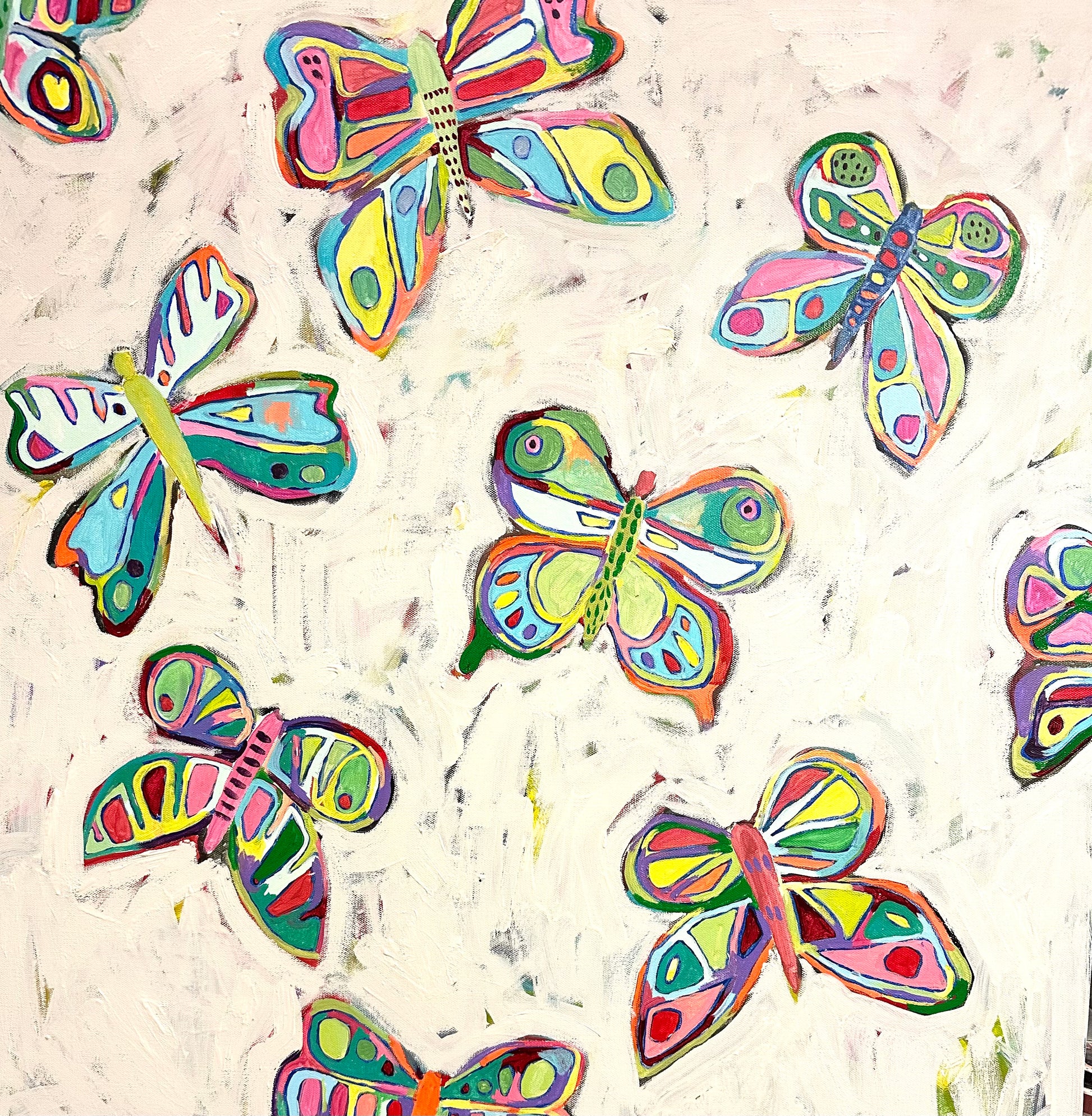 This painting is so much fun! Ginny is doing a butterfly series. She starts with bold color that is very messy. As she layers the paints, the piece comes together. She usually does just one butterfly but wanted to experience many butterflies on one canvas. This piece is so fun and shows lots of action and commotion. It is 30 x 30 painted on a 2 inch canvas.