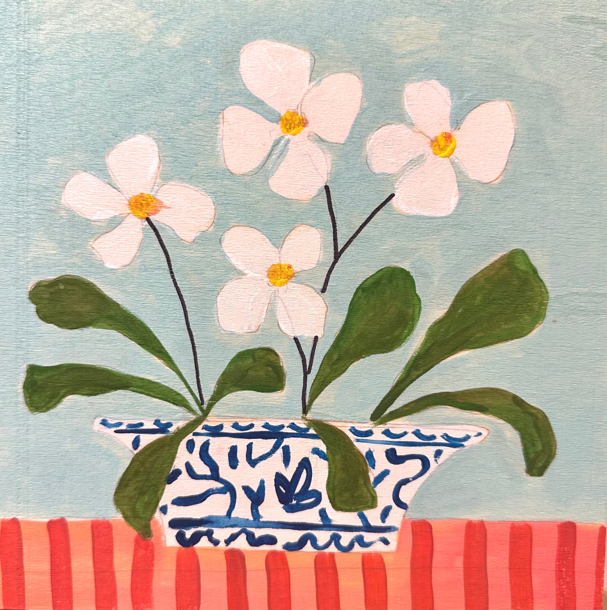 This 8x8 painting captures the timeless beauty of white orchids arranged in a classic blue and white vase. Painted in acrylic on a ½-inch panel board, it combines traditional elegance with a fresh, colorful feel. A simple yet striking piece — beautifully balanced, refined, and ready to brighten any space.