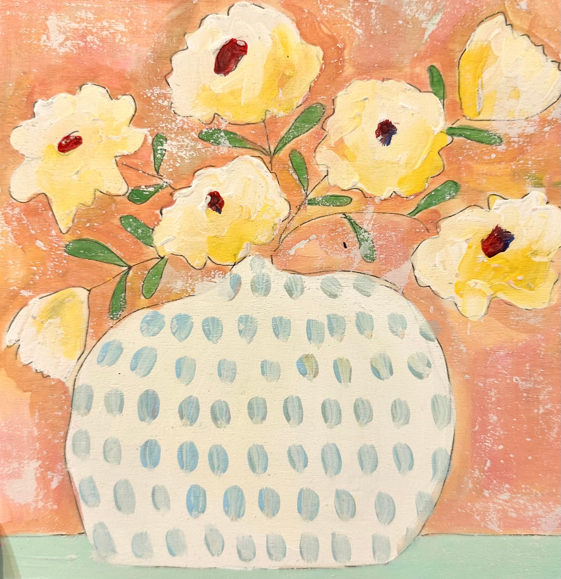 This charming 8x8 acrylic painting on a ½-inch wood panel features a playful floral arrangement in a whimsical polka-dotted vase. Soft yellow blooms float lightly against a gentle pink background, creating a cheerful, airy composition full of joy and color.